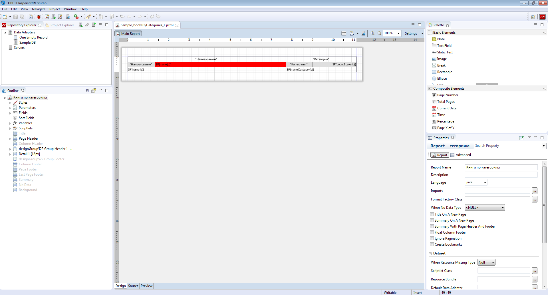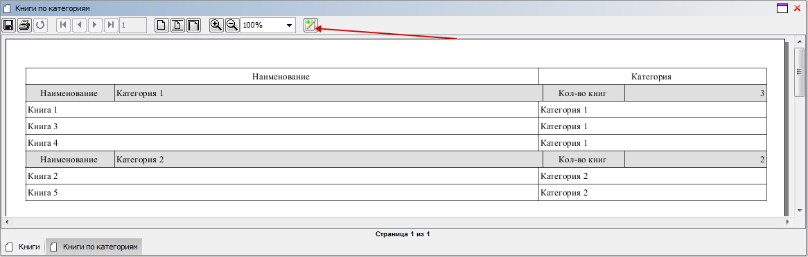 Since categories and books are associated, a single flat report will be created with categories represented as groups of books. Report data will be transmitted in a flat, denormalized form, where a separate (Field) field will be created for each property. A group (Group) and a corresponding header block (Group Header) will be created for categories.