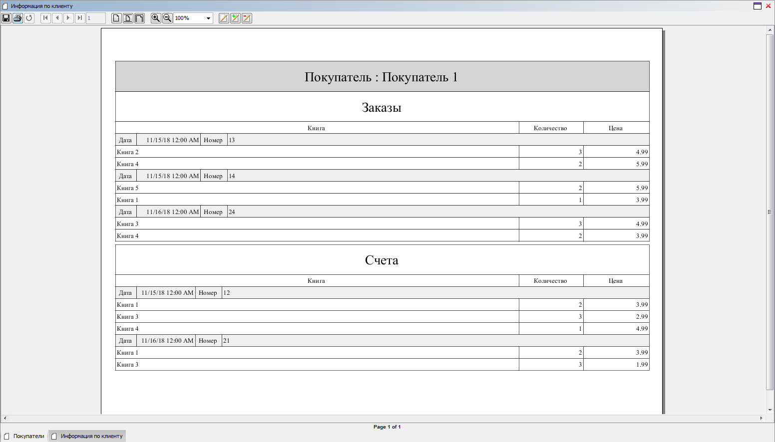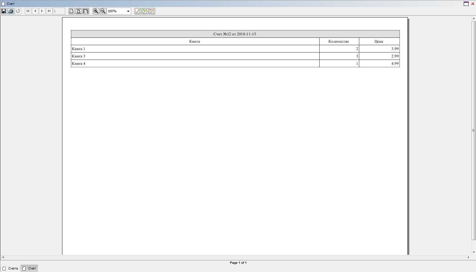 Then, we start the server from the IDE, launch the desktop client, open the form with books and click the created "Print" button. The system will automatically create a print-ready form and open it in the preview mode. Then, click the button below: