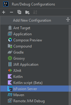 In the window that opens, click + in the upper left corner and select lsFusion Server from the drop-down list