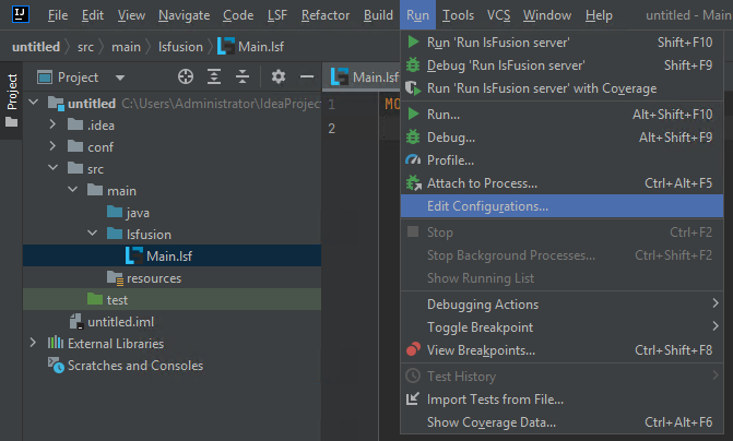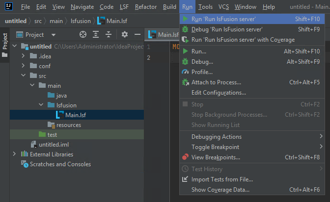 When you create a new project, a server startup configuration is also created by default. You can run it by selecting Run -> Run 'Run lsFusion server' or by clicking on the symbol next to the caption
