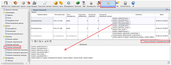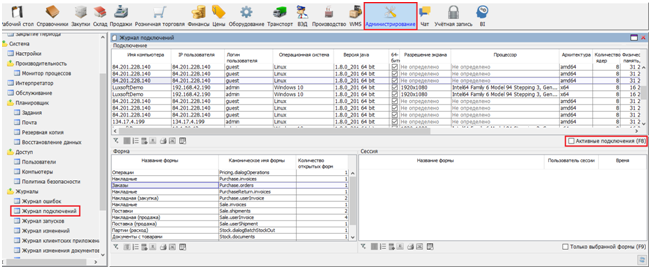 The log stores information about users who connected to the system, from which computer, the characteristics of that computer, as well as information about the date and time of connection / disconnection. On the form, you can display the users currently working with the database: Active connections.