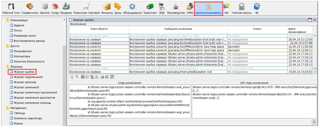 The Exception trace section displays the java stack for the error; the Exception LSF trace displays the lsfusion stack.