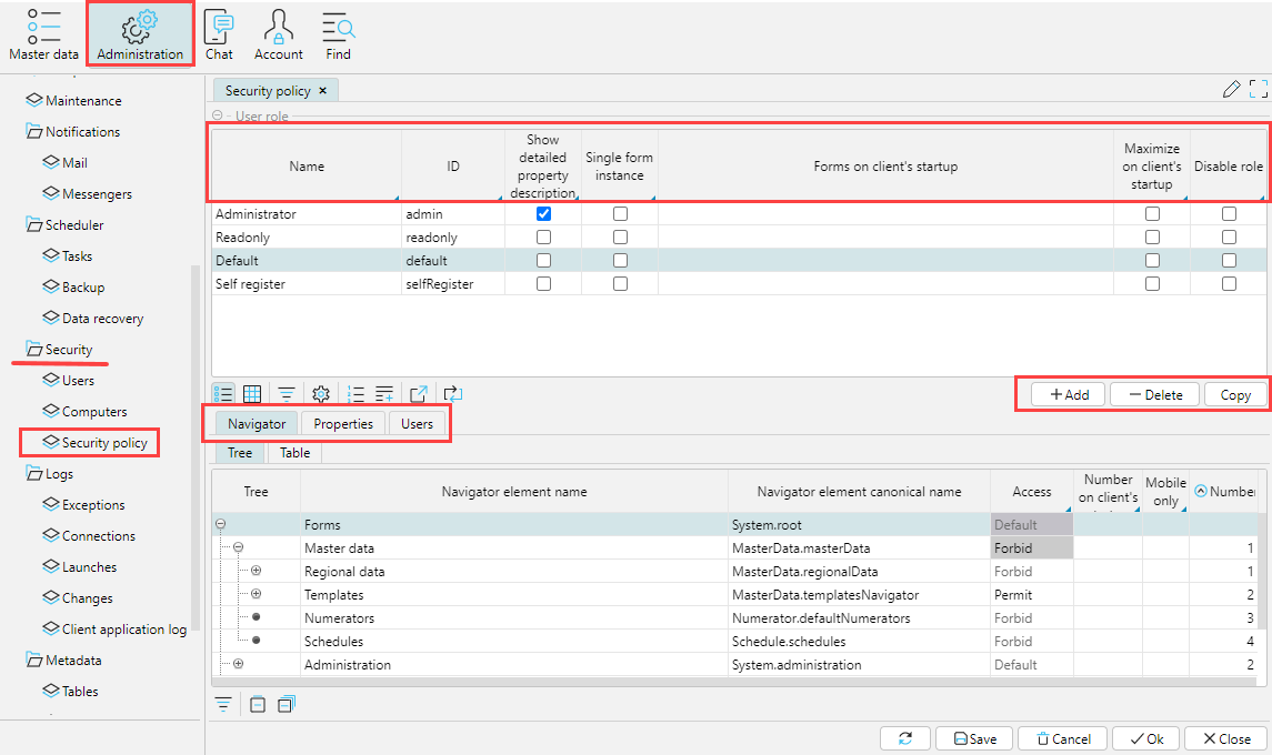 The security policy for each Role is configured in the Administration > Security > Security Policy. This is where the composition of Roles is determined, using the Add, Delete, and Copy buttons. When a Role is copied, all rights are copied too.