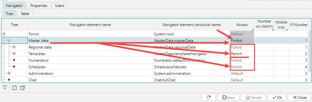 The status set for a tree branch automatically applies to child branches. If necessary, a child branch can be set to a different access status, in which case the status of the parent element will be highlighted with a gray background, so that the user can visually determine that there are elements with a different access status in the structure of this branch. According to the settings shown in Fig. 4 only Templates forms are available to the user in the Master data menu.