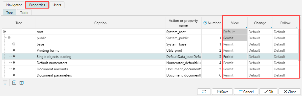 The access status for Properties is set in the same way as for Forms. However, given the large number of different properties in the application, on the Properties tab it is convenient to define the access level to the property group corresponding to the upper branches of the tree, or to view the status of role permissions in terms of properties.