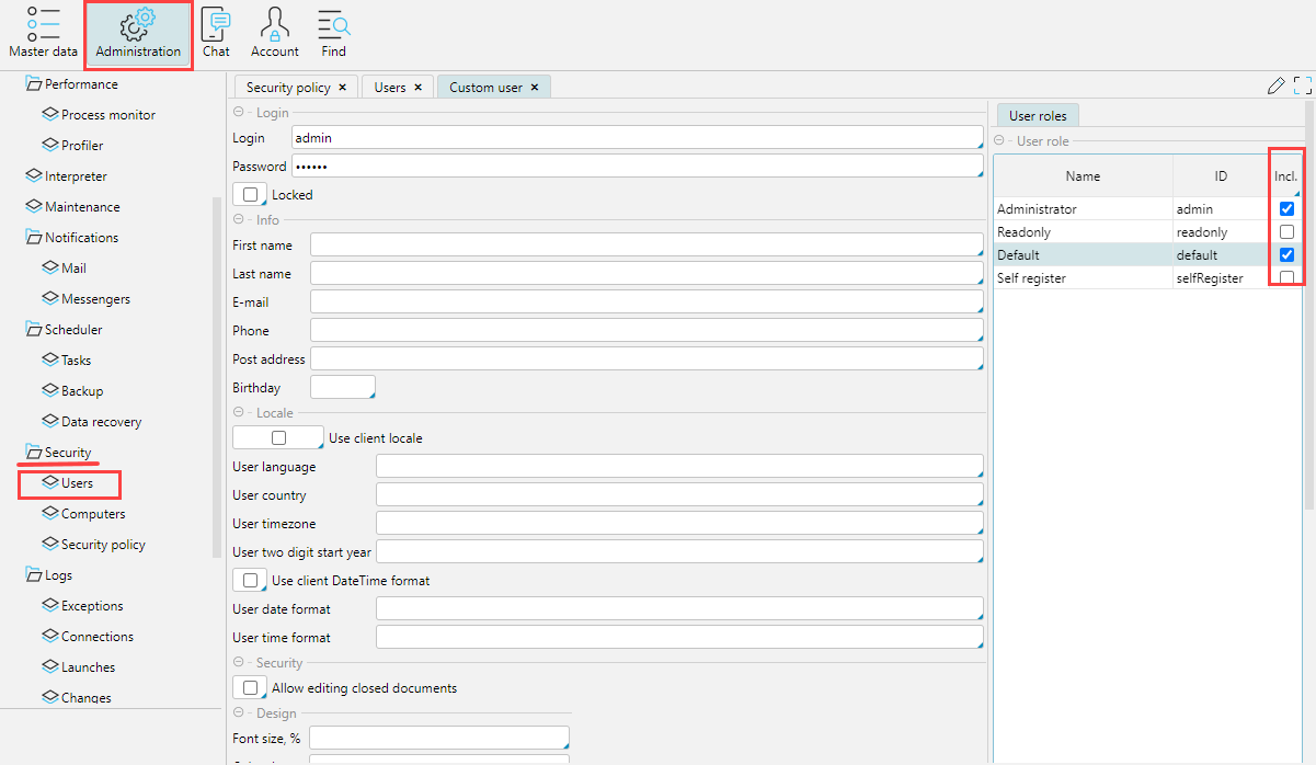 • Single form instance - when selecting a form already open on the desktop in the navigator, the user will go to it, no additional window will be opened. If there is a need to open several windows with this form, it is necessary to hold the Ctrl key when calling the form. This restriction can also be set for a specific user on the Users tab.