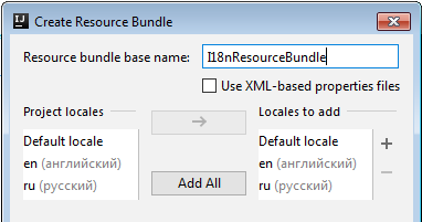 Называем его, например, I18nResourceBundle (система будет считывать только файлы, которые заканчиваются на 'ResourceBundle') и выбираем языки, которые будут использоваться :