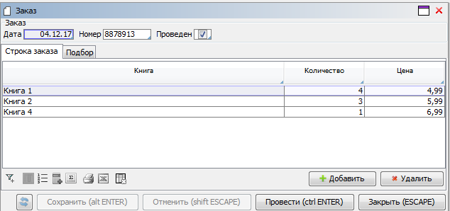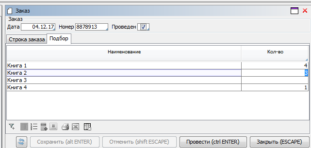 В случае, если в заказе будет две или более строк с одной книгой, то система сбросит количество в первых строках и проставит введенное количество в последней строке. Чтобы изменение касалось только последней строки, то нужно при записи количество использовать следующее действие: